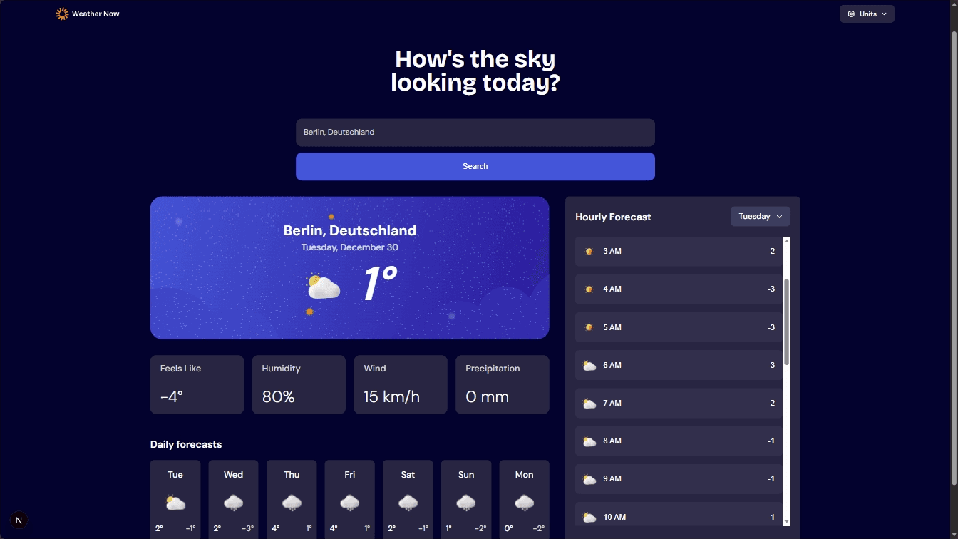 A weather app displaying weather data fetched from the openmeteo api